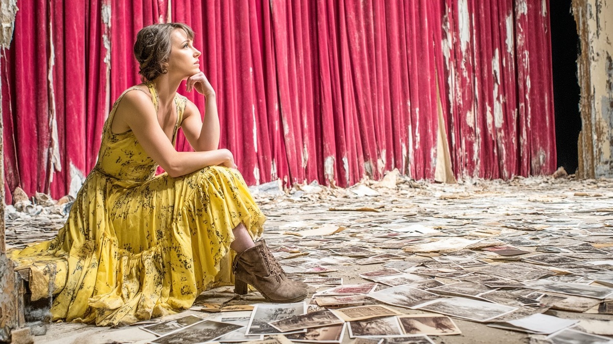 Создано на основе запроса: An old theater stage transformed into an emotional archive, a solitary figure in a yellow silk dress carefully