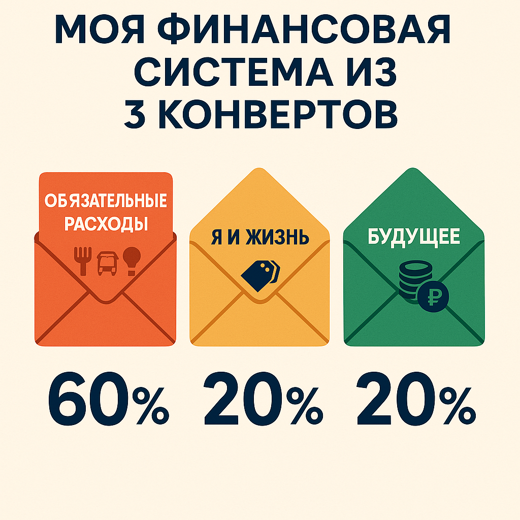 Однажды я поймал себя на мысли: деньги утекают. Вроде зарабатываю, а на второй неделе месяца уже пусто. Тогда я нашёл старый, но рабочий способ — финансовая система из 3 конвертов. Вот как она изменила мою жизнь: Это база: Я первым делом откладываю на это. Без этого жить нельзя. Всё фиксируется — чтобы не было сюрпризов. 2. Конверт «Я и жизнь» — 20% дохода Сюда входят: Это мой комфорт. Если сильно захочется пиццы — беру отсюда, а не лезу в "святое". 3. Конверт «Будущее» — 20% дохода Вот здесь магия: Я начал с 500₽ в месяц. Сейчас уже по 5 000₽. Не трачу вообще — только откладываю. И копится! Я не храню деньги в реальных конвертах — это просто система. Использую 3 банковских карты или копилки в приложении. Система 3 конвертов — это простой способ взять финансы под контроль. Неважно, сколько ты зарабатываешь — важно, как ты распределяешь. Начни сейчас. Это реально работает.