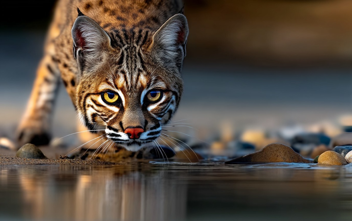 Создано на основе запроса: highly detailed bobcat in natural habitat, eyes glistening in sunlight, walking on the beach, macro photography