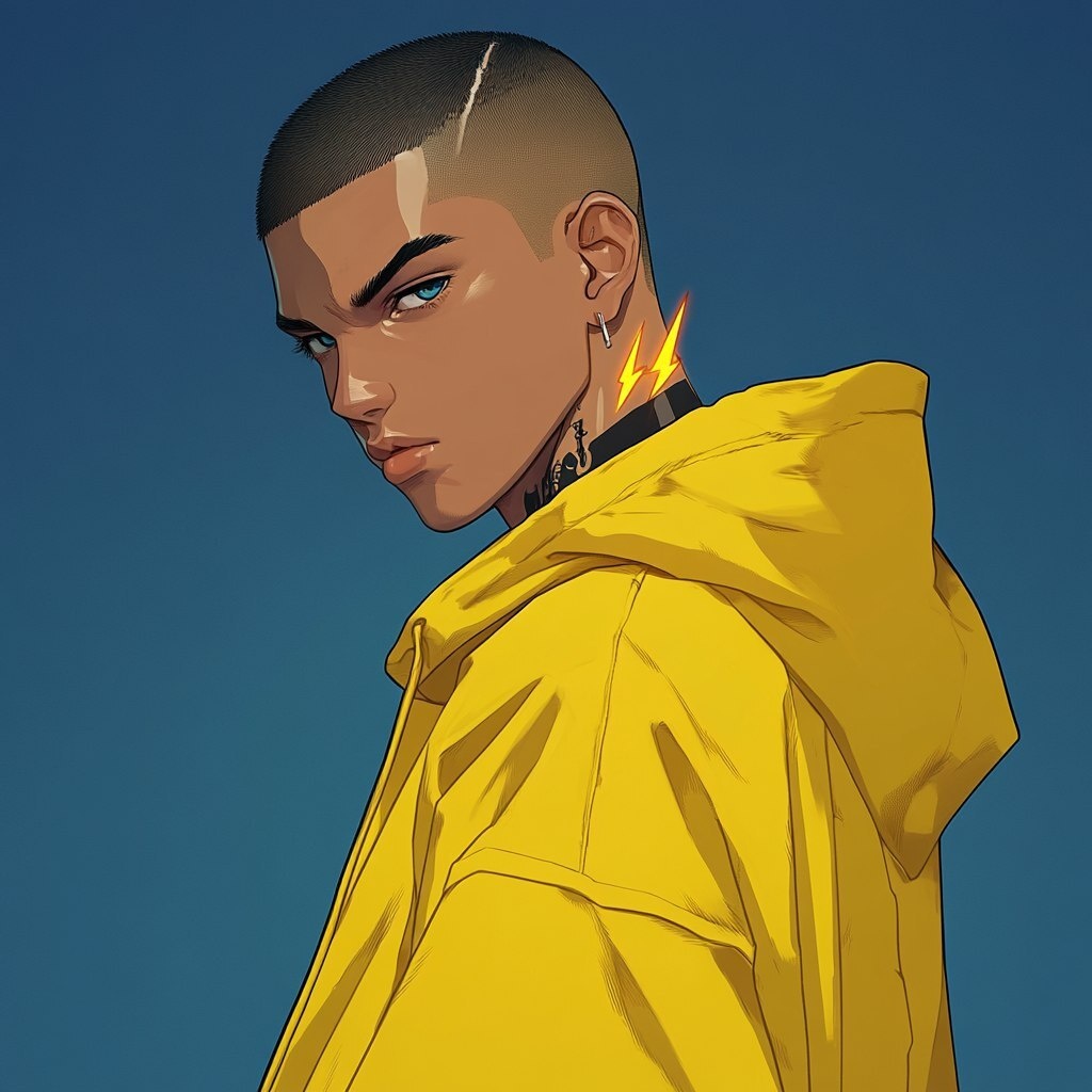 Создано на основе запроса: teenage trainer in pokemon anime style, neon-yellow hoodie, buzzcut with lightning bolt shaved into one side