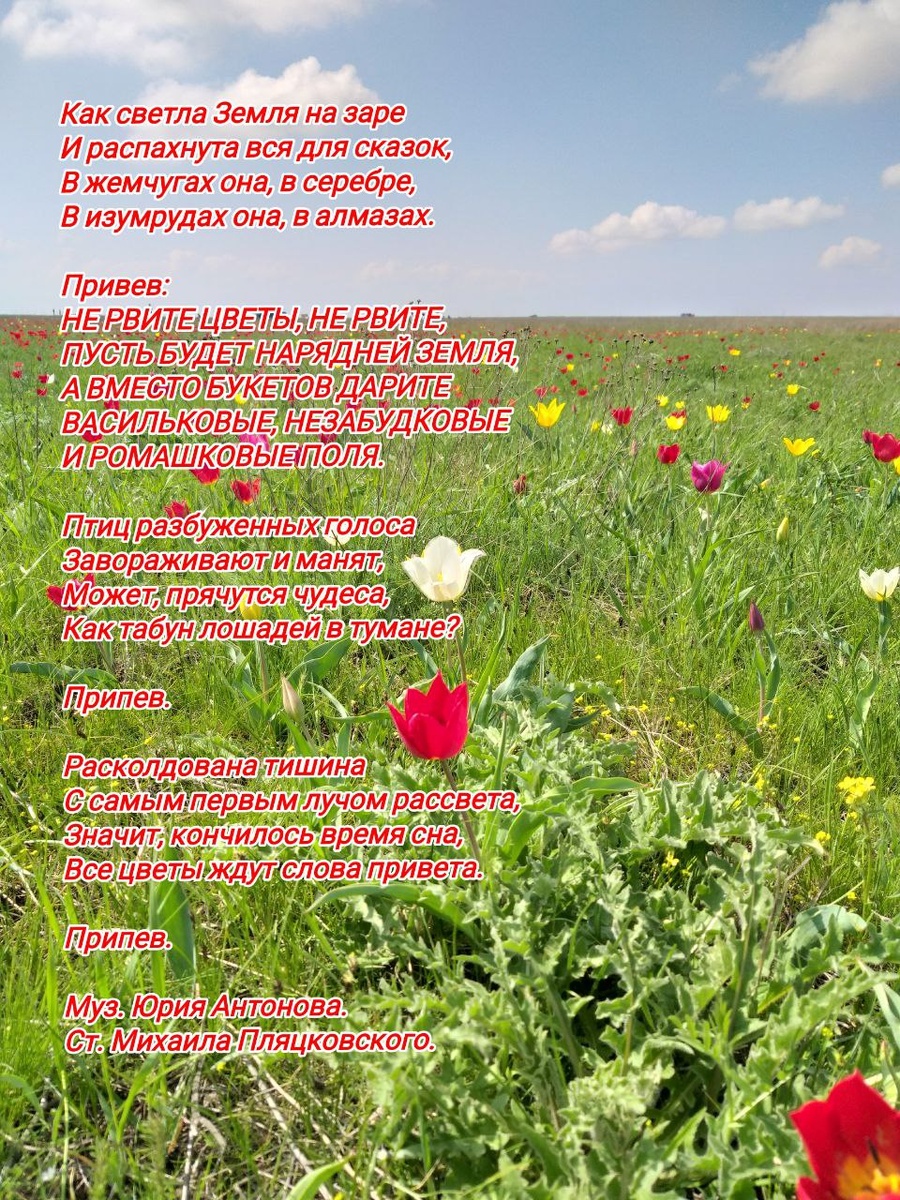 НЕ РВИТЕ ЦВЕТЫ, НЕ РВИТЕ, ПУСТЬ БУДЕТ НАРЯДНЕЙ ЗЕМЛЯ. Прочитал о том, что уже официально зафиксированы на Фестивале тюльпанов в Калмыкии случаи срыва тюльпанов. Люди! НЕ РВИТЕ ЦВЕТЫ, НЕ РВИТЕ, ПУСТЬ БУДЕТ НАРЯДНЕЙ ЗЕМЛЯ, А ВМЕСТО БУКЕТОВ ДАРИТЕ ВАСИЛЬКОВЫЕ, НЕЗАБУДКОВЫЕ И РОМАШКОВЫЕ ПОЛЯ. /Муз. Юрия Антонова. Ст. Михаила Пляцковского.