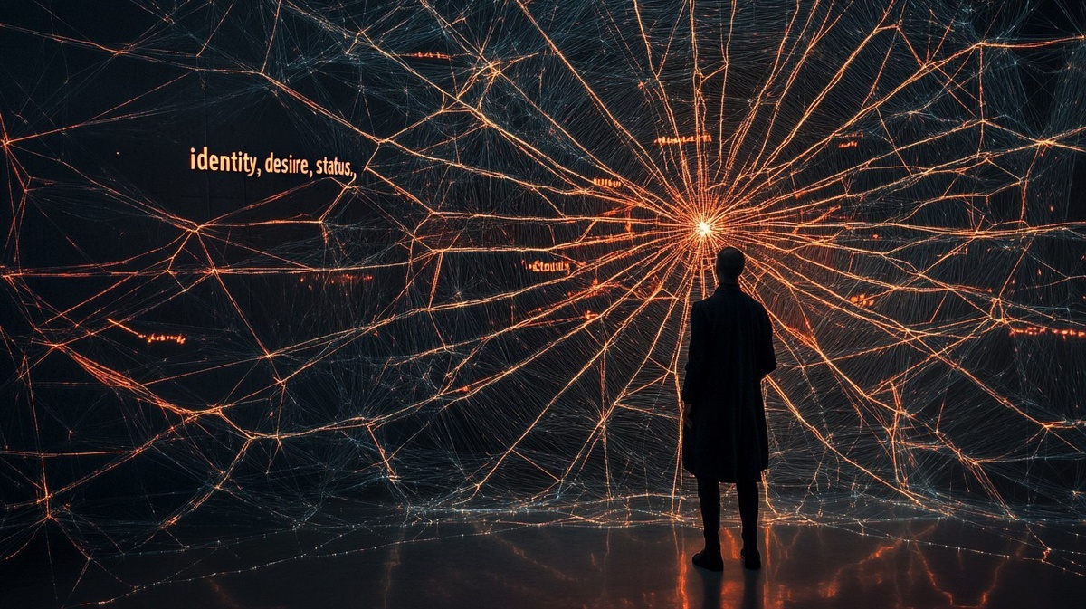 Создано на основе запроса: A spider web made of glowing threads labeled "identity," "desire," "status," catching people unaware the monk