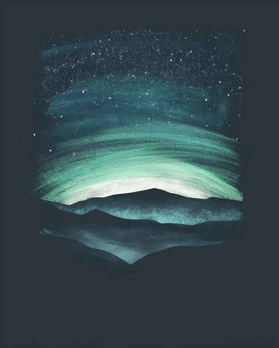 Создано на основе запроса: Minimalist digital artwork, northern lights sweeping across a dark navy night sky, teal and white aurora arc, soft rolling mountain silhouette below, geometric style, poetic atmosphere, clean composition, no text, centered layout for T-shirt print, --- Автоперевод: Минималистские цифровые работы, северное сияние, прометантное по темному темно-морскому ночному небу, бирюзовой и белой дуге Авроры, мягким холмированным горным силуэтом внизу, геометрический стиль, поэтическая атмосфера, чистая композиция, без текста, центр макета для печати футболки, Красиво выглядит? 🤔 https://dzen.ru/id/65c0c65c86e4f837c27b24d7 #ИИ #AI #нейросеть #midjourney #art