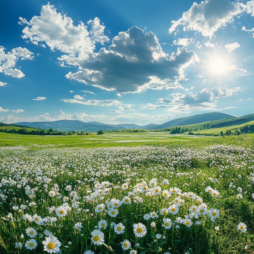 Создано на основе запроса: relaxing green nature with flowers and blue sky