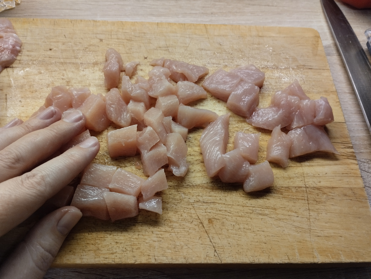 Забавное получилось название, потому что курица всё-таки птица, и гнездо у нее действительно может быть. Но настоящее гнездо мы, конечно же, готовить не будем. А будем готовить саму курицу. Блюдо получается всего 160 ккал на 100 грамм. Сыр я брала не диетический, у меня он жирностью 50%. То есть калорийность можно ещё сократить если добавить менее жирный сыр. Овощи можно варьировать по ситуации, они не дают много калорий. Поэтому калорийность блюда особенно не изменится. 1. Порежьте филе на мелкие кусочки: 2. Посолите их по вкусу, добавьте сметану: 3. Тщательно перемешайте и оставьте на 20 минут. 4. Пока курица маринуется, порежьте лук и протрите морковь: 5. Отдельно потрите сыр: 6. Половину сыра смешайте с луком и морковью: Это необходимо сделать, чтобы они были вкуснее, и не растеклись. Так как овощи мы не обжариваем отдельно. 7. По истечении двадцати минут, выкладываем из мяса подобие гнезд на смазанный противень. В центр необходимо поместить смесь овощей и сыра: 8. Отправляем