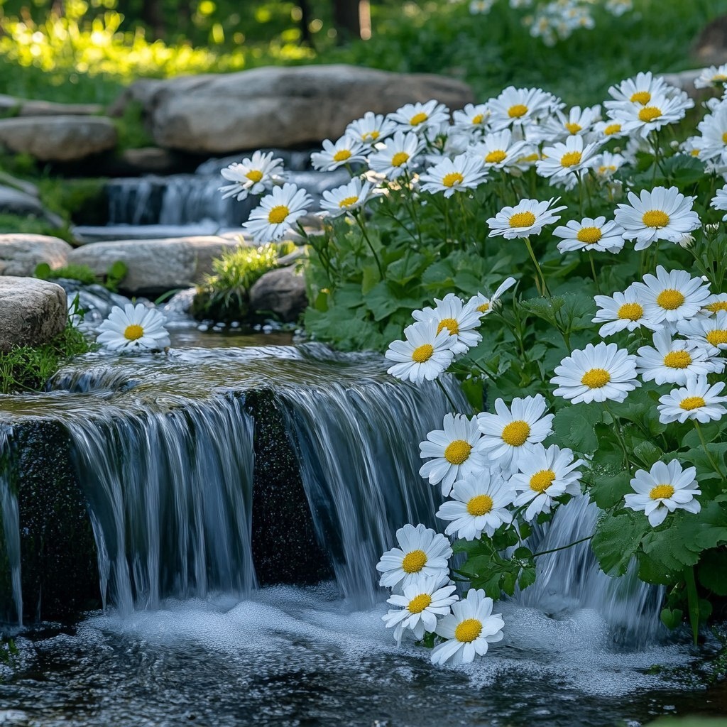 Создано на основе запроса: relaxing waterfall with flowers, white, heavenly, photo