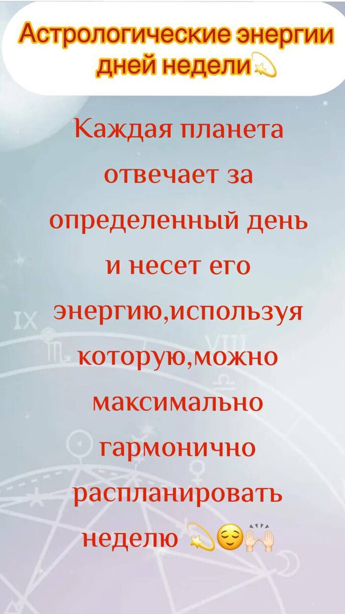 Итак,вот наш ценнейший список⤵️ Понедельник- 🌙Луна. ✅Медитации,растяжка,йога,дыхательные практики,работа с подсознанием,эзотерика, действия по расслаблению вашей Луны(доступно к заказу),лень,переедание(следим за этим). ❌ Не очень хорош для начала активных действий. Вторник-🪐Марс .✅Начало активных действий.Спорт,соревнования, решение спорных вопросов,больше движения,достигаторства, выпускаем агрессию,добавляем сексуальность. ❌не допускаем лень. Среда-🪐Меркурий.✅Обучение,краткосрочные поездки,вопросы связанные с транспортом,активный мыслительный процесс,общение,устные выступления,написание постов/контент плана. Четверг-🌈Юпитер.✅Обучение,расширение кругозора,духовные практики,изучение иностранных языков,работа с иностранцами,поездки за границу,благотворительность, покупка статусных вещей,приобщение к элите,выход в свет. Пятница-🪐Венера. ✅Добавляем удовольствия,любые уходовые процедуры,одеваемся и делаем действия по вашей Венере(доступно к заказу),спа,массаж,тратим деньги на удов