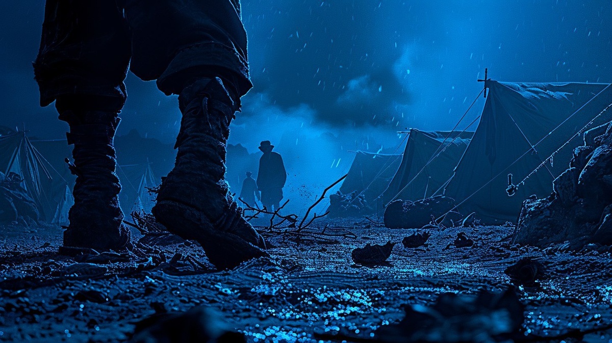 Создано на основе запроса: A close-up shot in the dark night during the Han Dynasty, focusing on the moment one person accidentally steps on a dry twig, causing it to snap. The scene is set near Xiongnu tents, visible in the background, adding to the tension. The person is wearing traditional Han Dynasty shoes, made of leather or cloth, with intricate patterns typical of the era. The moonlight casts a faint glow, highlighting the texture of the twig and the shoe. The other person is seen in the background, also in traditional attire, conveying a sense of urgency and fear. The forest floor is covered with fallen leaves, and the atmosphere is tense and eerie.High quality, detailed, 8k.