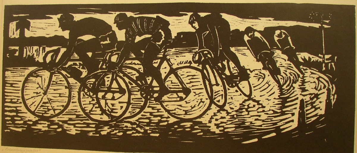 Дорогие жители и гости города! Поздравляем вас с Днём спорта! Пусть ваша энергия и желание достигать новых высот вдохновляют не только вас, но и всех вокруг. Искусство и спорт идут рука об руку, обогащая нашу жизнь и наполняя её смыслом. Желаем вам радости, успехов и ярких побед на спортивных аренах! Коробской Анатолий Петрович. Велогонка. (Борьба). Из серии "Спортивный Дон", 1962 год, линогравюра, бумага. Собрание Таганрогского художественного музея. #таганрогский_художественный_музей #в_этот_день