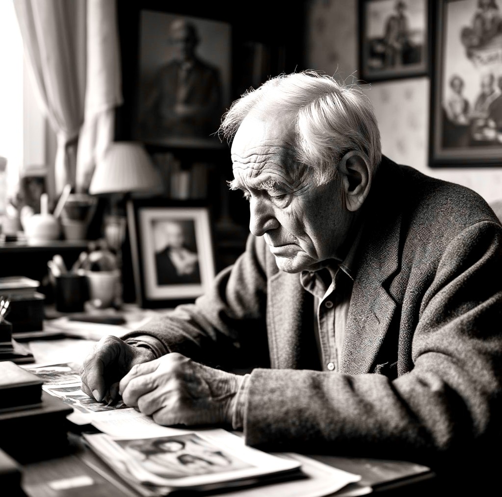 Старик сидит за столом, бережно разглаживает своими высохшими от времени, непослушными уже пальцами старое чёрно-белое фото. Смотрит мутными от слез глазами, вглядывается в такие родные, такие счастливые лица...