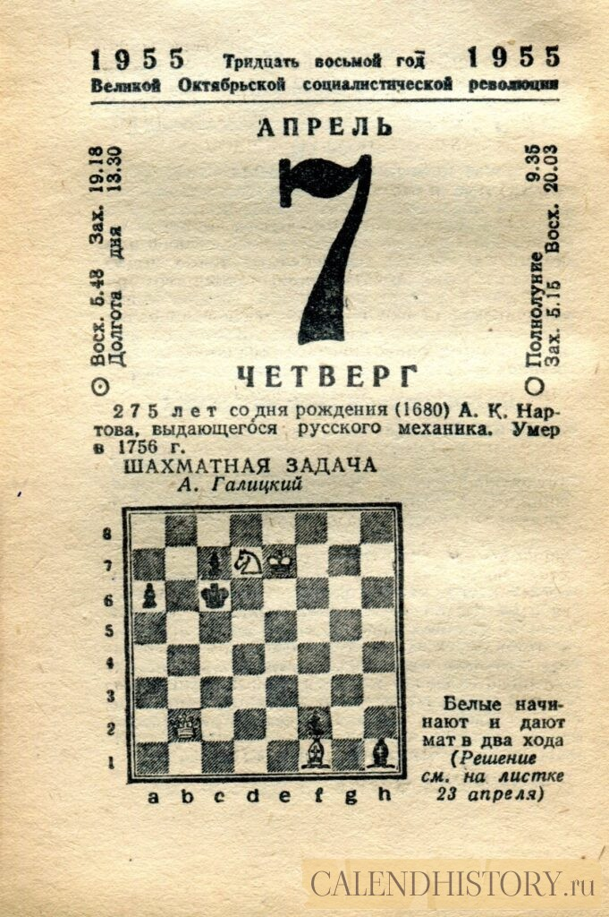 Итак, сегодня 7-го апреля и у нас на календаре 1955-й год. Перед нами листок советского календаря Политиздата. На календаре у нас четверг - 7 апреля 1955-го года. 275 лет со дня рождения (1680) А. К. Нартова, выдающегося русского механика. Умер в 1756 г. ШАХМАТНАЯ ЗАДАЧА
