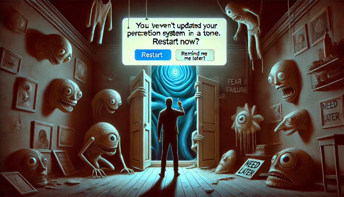 И как будто что-то внутри тебя говорит: “А может, пора?..” Ты тянешься нажать «ДА», но тут... Из ментального шкафа — как в дешёвом ужастике — начинают выползать знакомые лица: Они начинают на тебя давить: “Нажми «позже»! Пожалуйста! Всё же вроде работает… ну, кое-как.” Палец нависает над кнопкой.