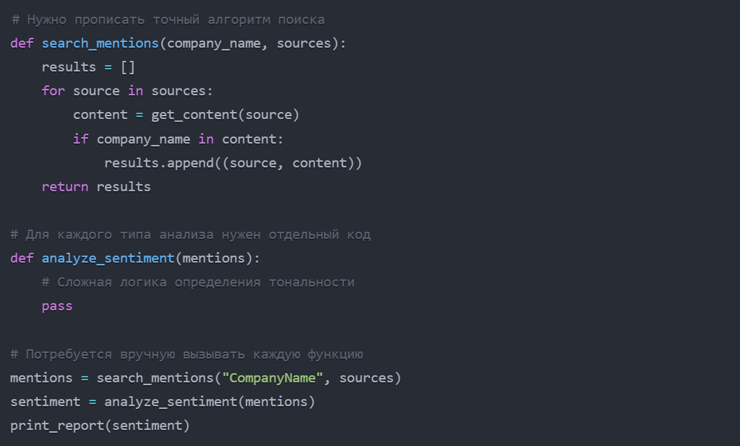 И каждый раз, когда вам нужна новая функция — например, анализ тональности или группировка по темам — приходилось бы дописывать новый код.
