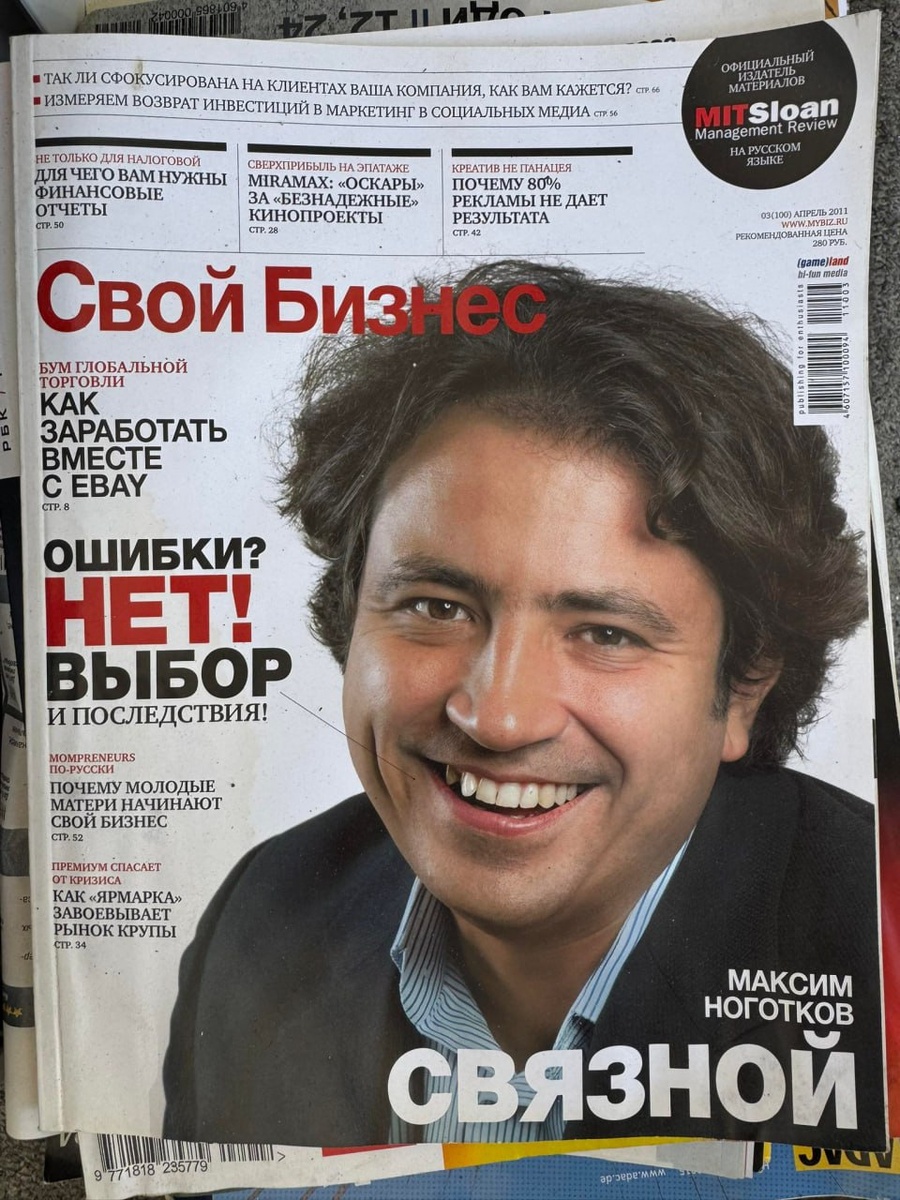 2011 год, обложка Свой Бизнес. Журнал такой был (по памяти пишу, подзабыл). А я помню как завидовал Связному и его собственнику - на картинке. Крутой бизнес строили, у них еще кажется Интернет- магазин был enter.ru... (щас не работает). Вот когда нужно было запускать эл.коммерцию, ведь o/w еще не раскачались до текущих состояний. А я занимался Инет-магазином zakazi24.ru и в пике у нас было 2600 заказов в сутки - продавали бытовку. Ностальгия :) (мы кстати щас с ребятами и делаем текущий бизнес, с кем строили тот магазин). Русский ИТ бизнес