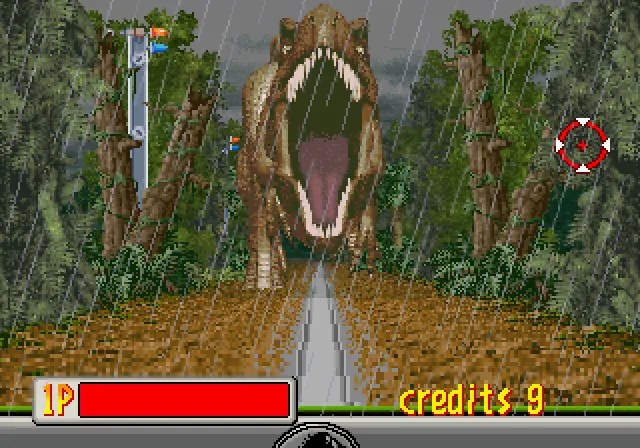 Несколько месяцев спустя мы вернулись на остров снова. Вечер-в радость, ретро-в сладость! Всем привет и сегодня мы играем в Парк Юрского Периода! Эта игра-некий аркадный аттракцион (после которого, если честно, Я долгое время решил не углубляться в Парк Юрского Периода...). Но ради Вас-я вернусь в этот аттракцион! За аркадным автоматом-Retroboy, поехали! Добро пожаловать в Парк Юрского Периода! Удачи! Ария 1: Мы должны отстреливаться от динозавров, которые будут встречаться нам на пути. Когда Я начал играть во второй раз, то вспомнил, почему решил не возвращаться к этой теме. Дело в том, что здесь есть тираннозавры, в которых нужно стрелять в голову, а сама игра выполнена в жанре аркады от первого лица. Как только мы скрылись от Т-рекса в пещере, на нас начали нападать более мелкие динозавры. Выбравшись из пещеры, мы столкнулись со стаей динозавров, от которых также нужно было отстреливаться. Почему так получается, что по классике жанра сначала бежишь к динозаврам, а потом убегаешь от