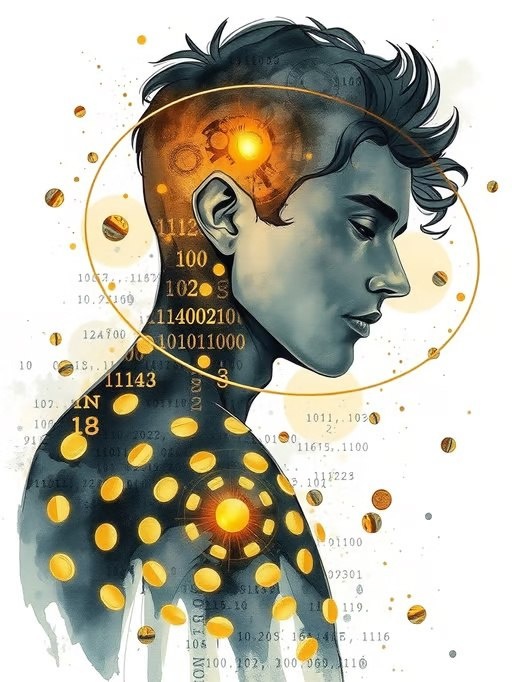 Человек-вычислитель. A delicate watercolor painting of a male silhouette with golden highlights, surrounded by intricate binary code patterns that resemble glitch art, filled with shimmering coins and mesmerizing fractals, set against a muted background with aged, translucent washes that evoke a sense of nostalgia, rendered with expressive, fluid brushstrokes that convey a sense of dynamic movement, the golden accents glistening like precious metal, the binary code swirling around the figure like a digital aura, the coins scattered about, reflecting the light, as if suspended in mid-air, the entire scene bathed in a soft, ethereal glow, with subtle texture and grain reminiscent of aged parchment, inviting the viewer to step into a realm where technology meets mysticism. #neuroart #нейроарт #ai #ии #нейросеть #картинки #искусственныйинтеллект #цифровоеискусство #digitalart #арт #art #prompt #промпт #подсказка