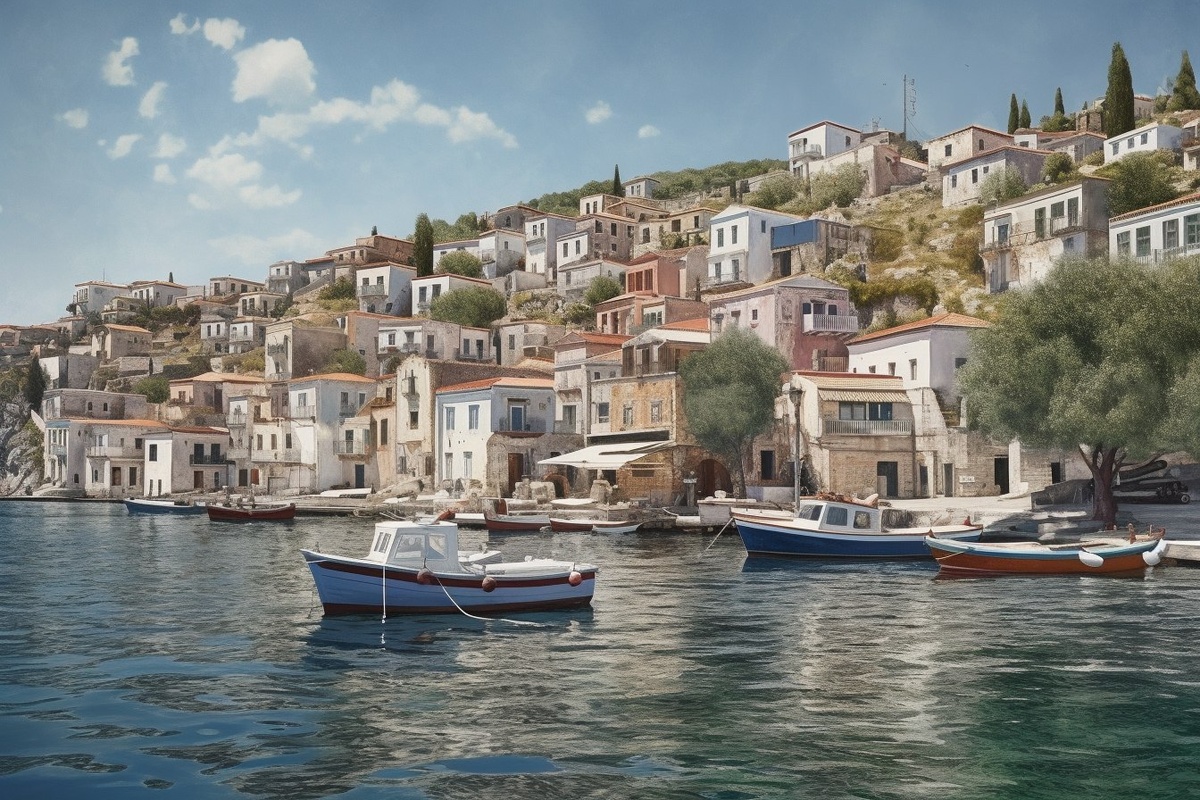 Создано на основе запроса: A photorealistic image of Neos Marmaras, Greece, showing the port with small fishing boats moored in the calm bay. The town’s white and pastel houses rise on the hillside, and locals sit at waterfront tavernas. A few tourists walk along the pier or browse souvenir stands. Soft Mediterranean daylight, real textures, nothing stylized. --- Автоперевод: Фотореалистическое изображение Neos Marmaras, Греция, показывающее порт с небольшими рыбацкими лодками, пришвартованными в Спокойной бухте. Как тебе эта иллюстрация? 🤔 https://dzen.ru/id/65c0c65c86e4f837c27b24d7 #ИИ #AI #нейросеть #midjourney #art