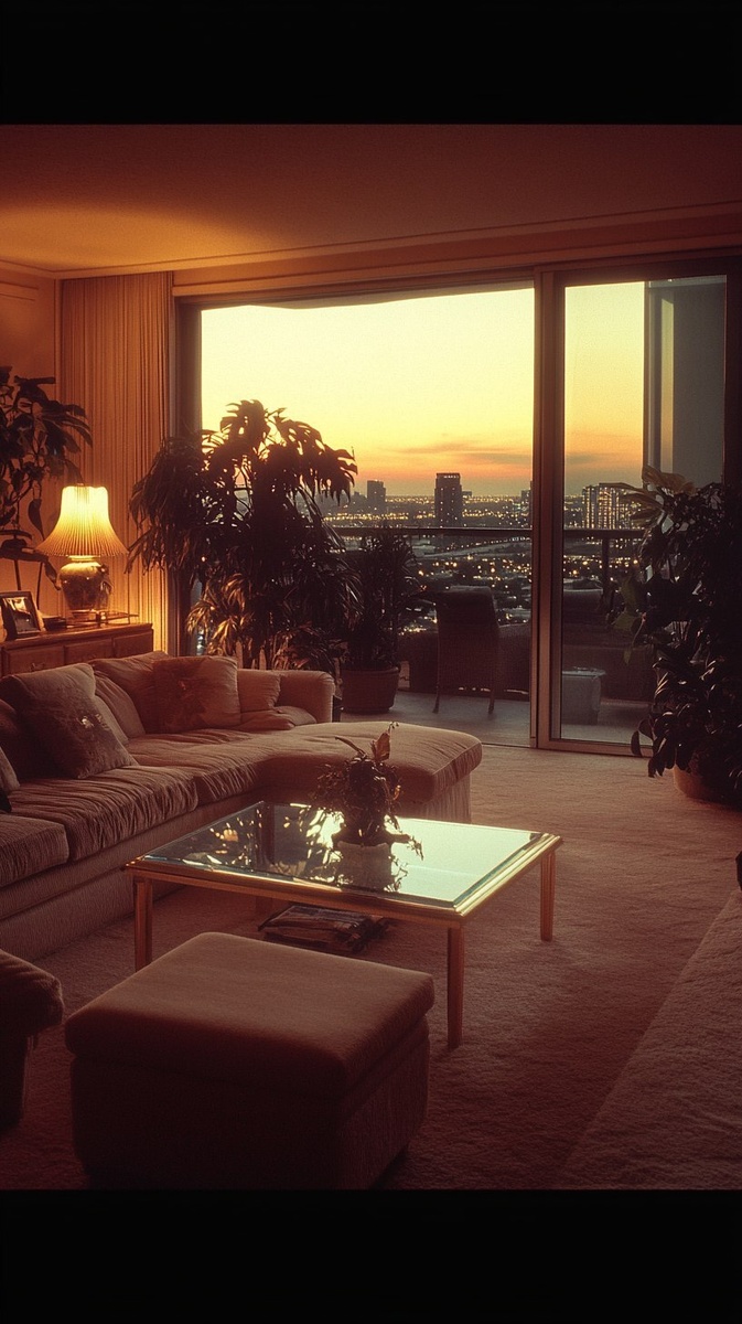 Создано на основе запроса: Miami. 1984. Deep sunset/almost night. Long establishing shot. POV of someone standing looking into the flat. The carpet is expensive beige. We are in a very large penthouse flat that overlooks the entire city. We are in the living room. It is at least 20 meters in length. Luxurious plush sofas and ottomans around a glass table. A Tropical plant next to the sliding glass door which leads to a large balcony. Which has more plants. Giving it a tropical feel. It is very chic. There are two platforms separated by a couple of steps. On the cabinet there is a lamp that is on, lighting up the dim flat. Cinematic. Photorealism. It looks like it was taken from a late seventies camera --- Автоперевод: Майами. Классно выглядит? 🤔 https://dzen.ru/id/65c0c65c86e4f837c27b24d7 #ИИ #AI #нейросеть #midjourney #art