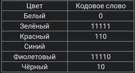 Для кодирования растрового рисунка, напечатанного с использованием шести красок, применили неравномерный двоичный код. Для кодирования цветов используют кодовые слова. Укажите кратчайшее кодовое слово для кодирования синего цвета, при котором код удовлетворяет условию Фано. Если таких кодов несколько, укажите код с наименьшим числовым значением. Примечание. Условие Фано означает, что никакое кодовое слово не является началом другого кодового слова. Это обеспечивает возможность однозначной расшифровки закодированных сообщений. Не забывайте подписываться на канал! Таким образом вы помогаете выходу новых разборов! Решение: Кодируем по дереву Фано. Указываем все известные кодировки цветов. Синий цвет кодируется кодом 1110. Итоговое дерево: По каналу связи передаются сообщения, содержащие только семь букв: С, В, Е, Т, И, Л, и О. Для передачи используется двоичный код, удовлетворяющий условию Фано. Кодовые слова для некоторых букв известны: Какое наименьшее количество двоичных знаков потр