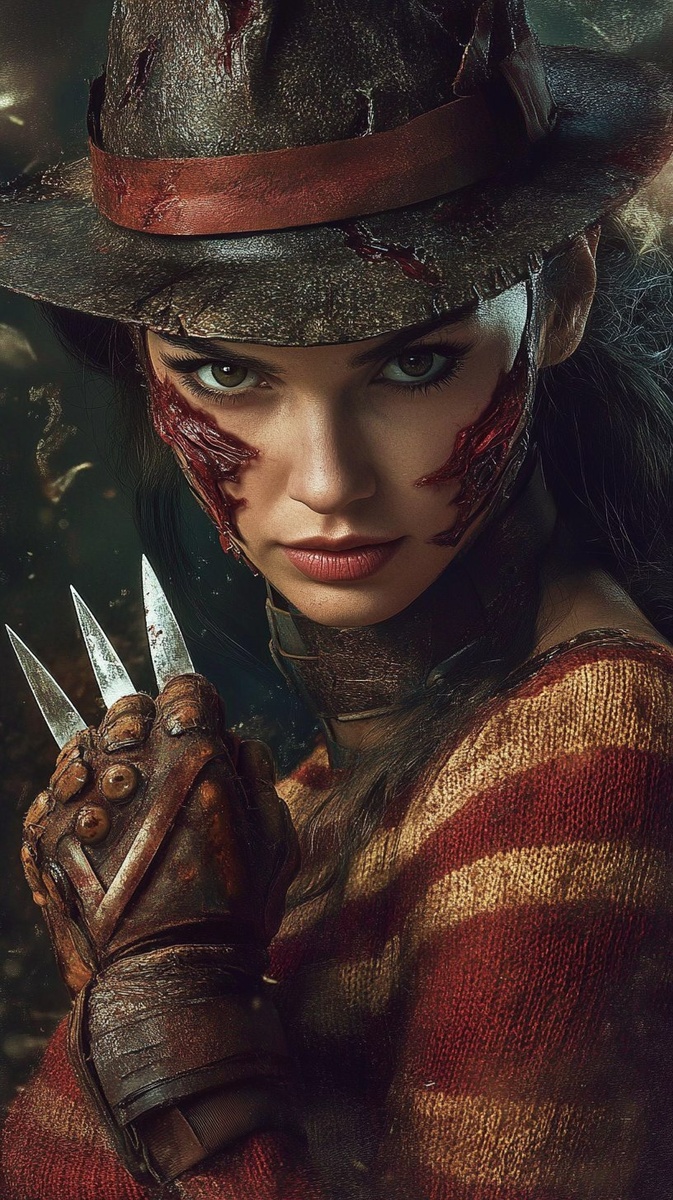 Автоперевод: Гипер -реалистичный гал Гадо Чудо -Женщина, сливаясь с Фредди Крюгером с его культовой бритвой перчаткой, шляпой и свитером из фильмов, в один отвратительный кошмарный персонаж