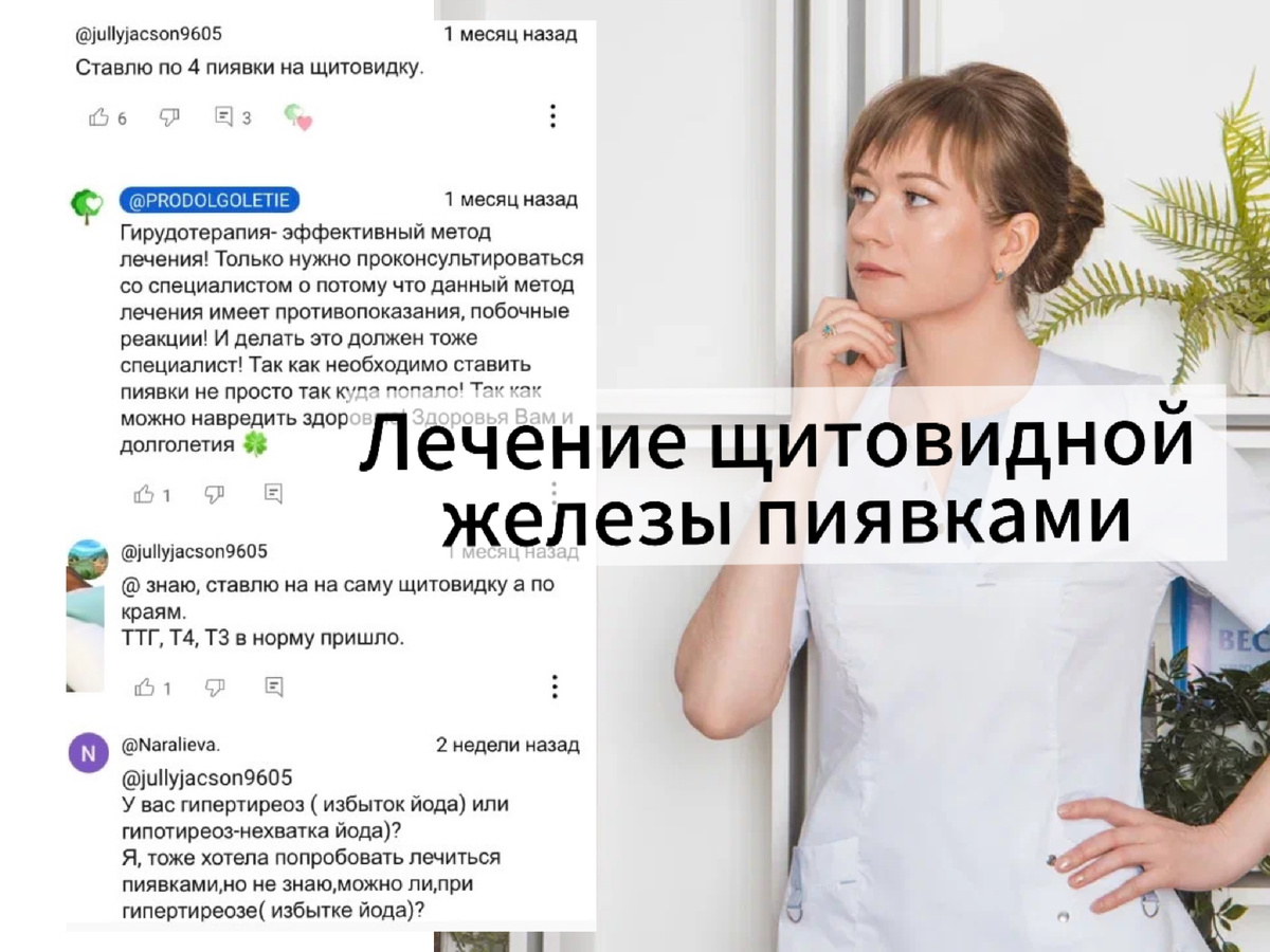 Заболевания щитовидной железы не лечат пиявками. Ни располагая над проекцией самой железы, ни по краям от нее. Почему могли прийти в норму гормоны у конкретного человека после такого нестандартного лечения? Нужно разбираться. Может быть изначально было незначительное колебание ТТГ (субклинический гипотиреоз - недостаток гормонов), может быть преходящий тиреотоксикоз (избыток гормонов) вследствие деструктивного тиреоидита… Ну и отдельно про термины: Гипертиреоз - избыток ГОРМОНОВ щитовидной железы, не йода. Йод в большом количестве может запустить избыточную выработку гормонов, но не является единственной возможной причиной. Гипотиреоз - нехватка ГОРМОНОВ щитовидной железы. Проживание в йоддефицитном регионе может способствовать развитию гипотиреоза, но чаще имеются другие причины его развития. Будьте осторожны с такими методами лечения осторожны и получите перед этим консультацию грамотного эндокринолога.