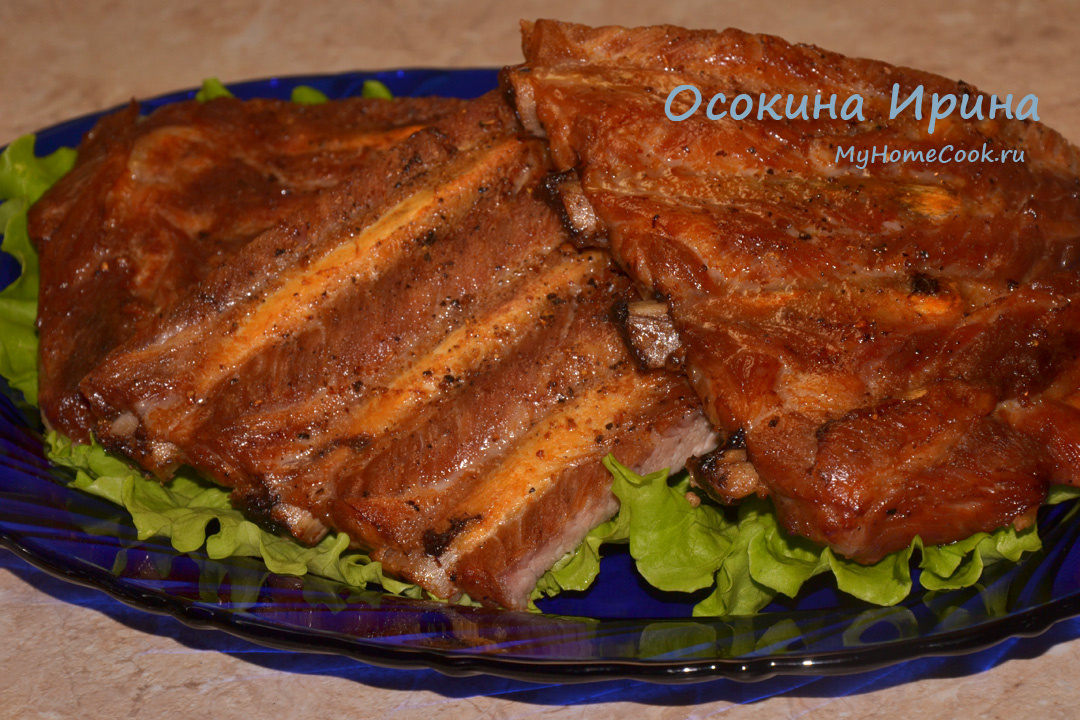 Блюдо насколько простое в приготовлении, настолько и беспроигрышное: ленту свиных рёбер на 800 г зачистила от плёнок, натёрла солью и перцем, уложила в форму для запекания, залила 0,5 л светлого пива и оставила на час подмариноваться, затем перевернула рёбра стороной, где была кожа, вниз и запекла в духовке, разогретой до 180 градусов, в течение 30 минут, затем перевернула рёбра и вернула форму в духовку ещё на 45 минут, периодически смазывая рёбра пивом из формы. Очень сочные и вкусные получились рёбрышки) Приятного аппетита