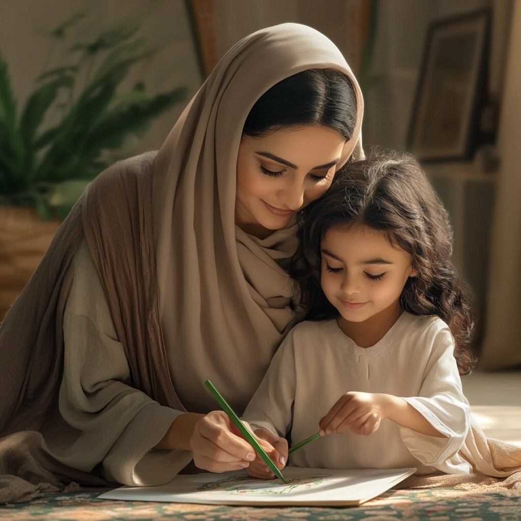 Создано на основе запроса: A realistic medium shot of a Saudi Arabian mother, around 30 years old, with tan skin and long dark hair on the side, not wearing a hijab, and having distinct Saudi facial features. She is dressed in modest clothing and lovingly embraces her 6-year-old daughter as she draws on a piece of paper with a green pencil. The daughter has tan skin and dark curly hair. They are sitting on the floor in a cozy living room with soft, diffused lighting, creating a warm and intimate atmosphere. The composition is well-balanced, with the subjects centered in the frame. The image captures fine details in clothing, facial expressions, and the surrounding environment, emphasizing a heartfelt family moment. --- Автоперевод: Реалистичный средний снимок матери Саудовской Аравии, около 30 лет, с коричневой кожей и длинными темными волосами на боку, не носить хиджаб, и имея отдельные саудовские черты лица. Необычно вышло? 🤔 https://dzen.ru/id/65c0c65c86e4f837c27b24d7 #ИИ #AI #н
