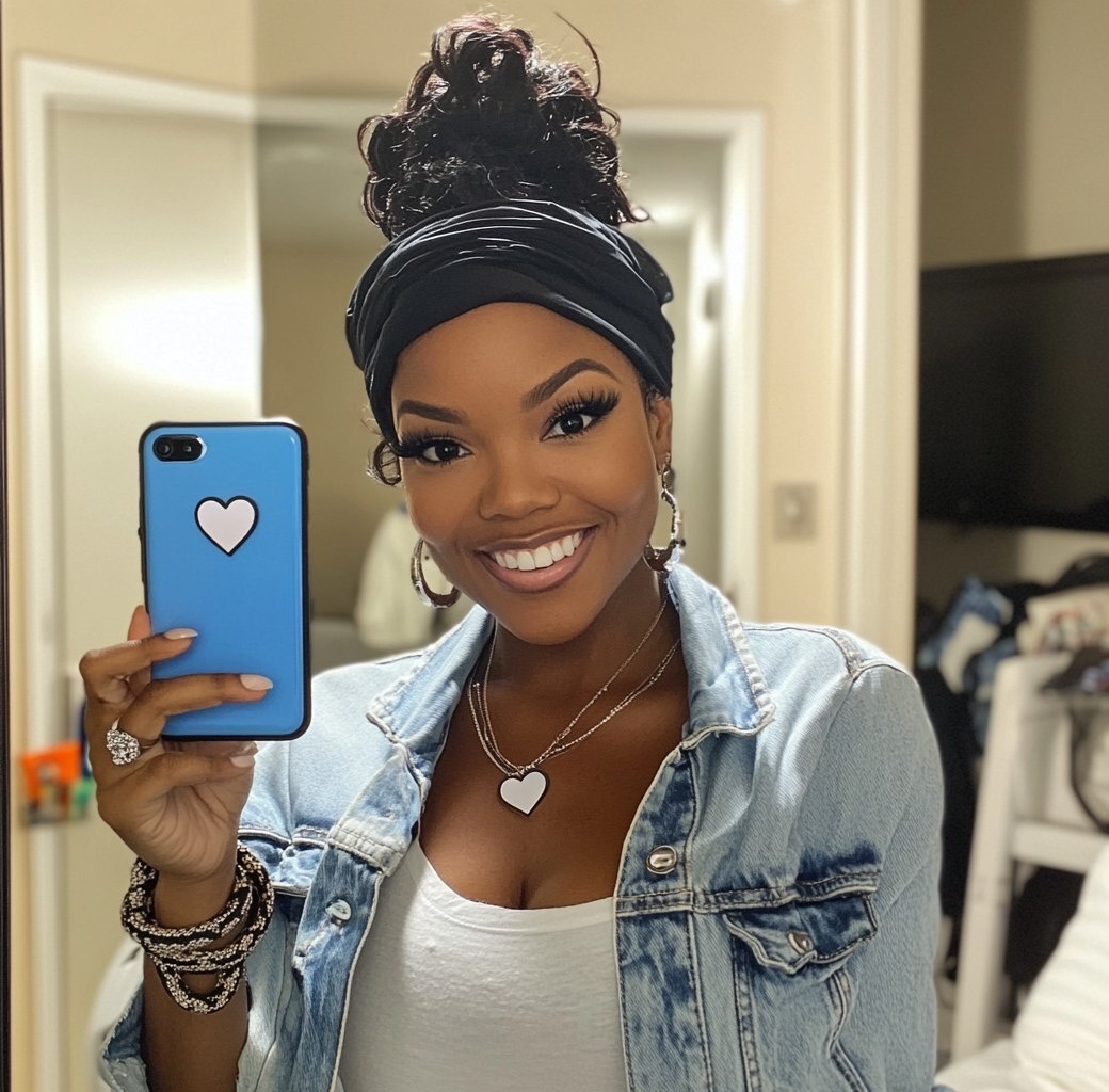 Создано на основе запроса: black woman taking selfie with blue iphone, wearing black headband and white jean shirt, she has diamond ring on