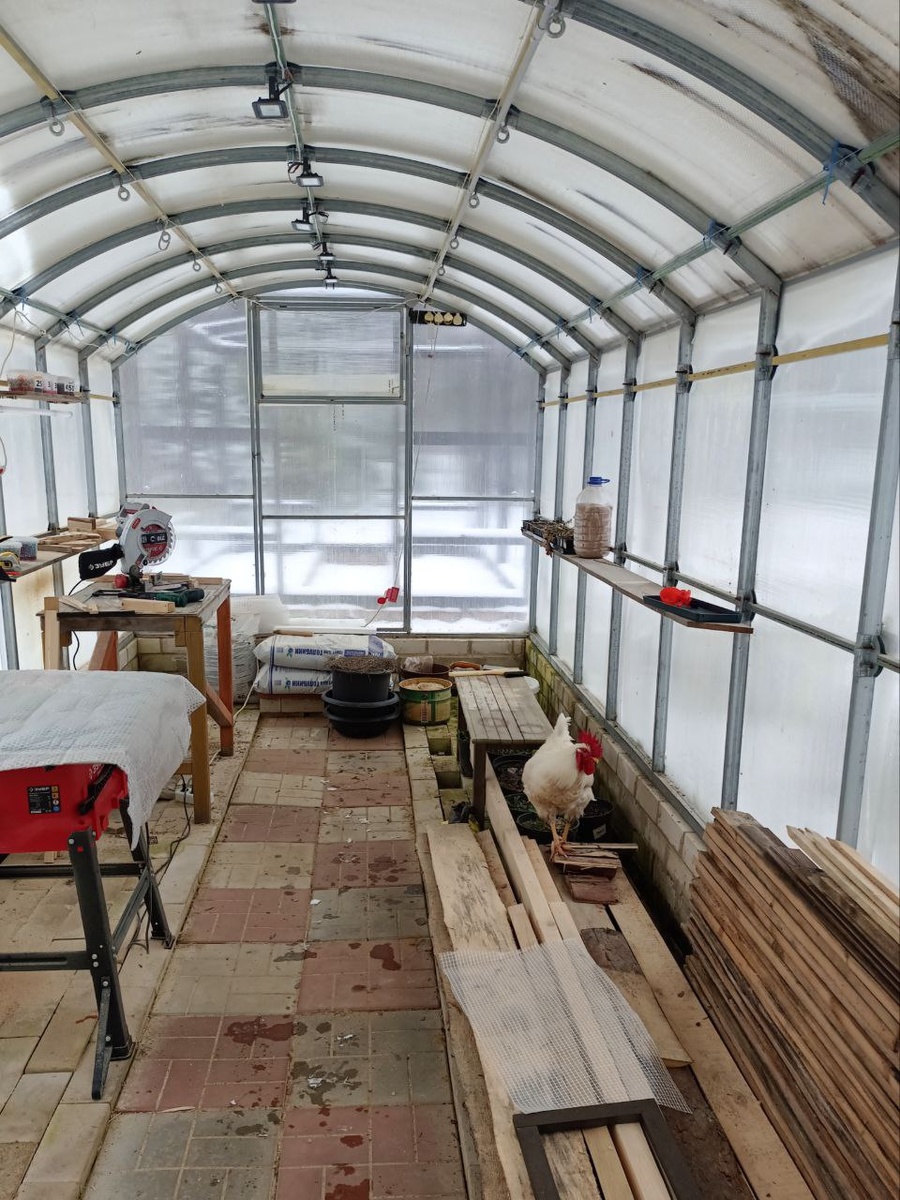 Учитывая снег и предстоящие лютые морозы — поместил Стёпку в томатной теплице. Где сейчас у меня столярная и огородная мастерская. Тут есть и песок. И солома. И много жёрдочек. И вода. И даже горшки, в которых уже выросли одуванчики да мокрец. Что-то Стёпке везёт на ништяки.