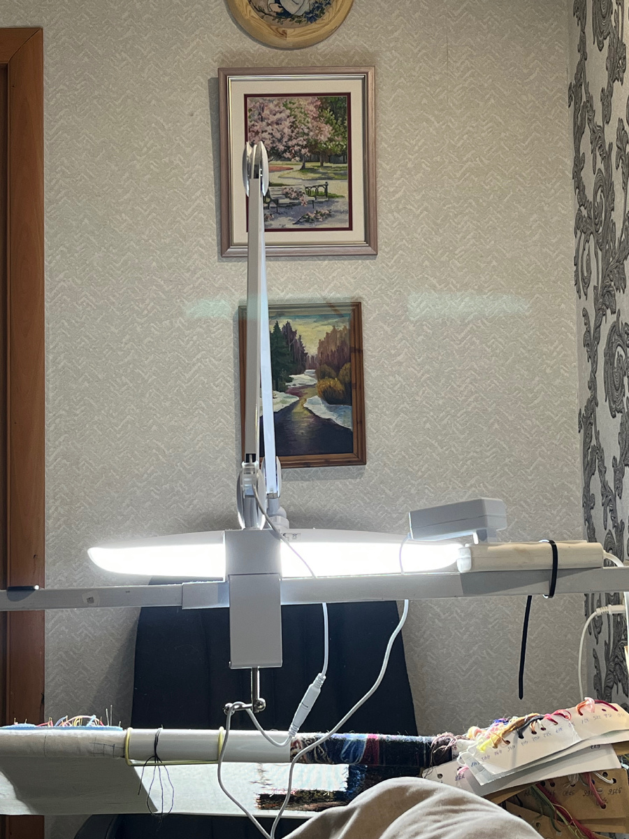 Статью хочется начать АААААА!!!! Наконец-то!!!! Да, наконец я решилась и приобрела таки себе бестеневую лампу AURA. Облизывалась я на нее лет семь. Но всегда что-то есть более нужное, более срочное, а цена у нее немаленькая. Но она явно стоит своих денег). Тяжеленькая она, однако). Не каждый станок ее удержит. Тяжелая и огромная). Зато какой свет) Даже камеру засвечивает). У нее 4 режима свечения, холодный свет. Разница с моими предыдущими светодиодными лампами - в разы. Это 🔥 Крепится на струбцине. Сама струбцина тоже очень тяжелая - на ногу уронишь, мало не покажется). В комплекте блок питания. Вот таким было освещение с моей предыдущей лампой И сейчас с аурой. Заметьте - теней нет)) Конечно, если возить рукой по канве, небольшая тень будет, полностью бестеневые лампы это миф. Но тень будет минимальной и еле заметной. Гарантия на лампу - 2 года. Но я надеюсь, что прослужит она мне намного дольше))🥰