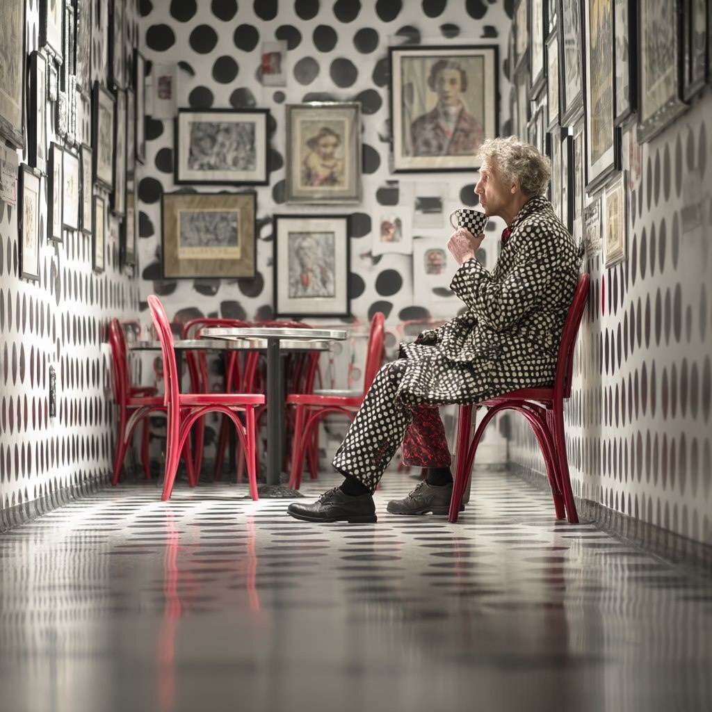 Создано на основе запроса: A lonely diner interior at night, walls and objects covered in infinite polka dots, a single figure in a polka-dot coat sipping coffee, surrounded by emptiness and mirrored reflections, cinematic lighting with soft melancholy, stillness meets obsession, Hopper’s urban isolation fused with Kusama’s hypnotic repetition --- Автоперевод: Одинокий интерьер закусочной ночью, стены и предметы, покрытые бесконечными точками в горошек, единственной фигурой в пальто в горошек, потягивающем кофе, окруженную пустотой и зеркальными отражениями, кинематографическое освещение с мягким меланхолием, встречается навязчивой, одержимость Хоппера Интересно вышло? 🤔 https://dzen.ru/id/65c0c65c86e4f837c27b24d7 #ИИ #AI #нейросеть #midjourney #art