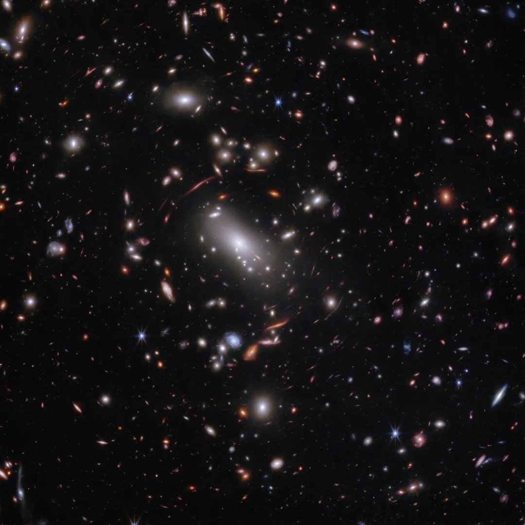 Массивное скопление галактик MACS J1423 Тысячи сияющих галактик, связанных гравитационными силами, образуют скопление MACS J1423. Оно действует как гравитационная линза, усиливая и искажая свет от объектов, расположенных далеко за ним — явление, известное как гравитационное линзирование. Изображение 2023 года получено с помощью прибора NIRCam телескопа «Джеймс Уэбб» (NASA/ESA/CSA).