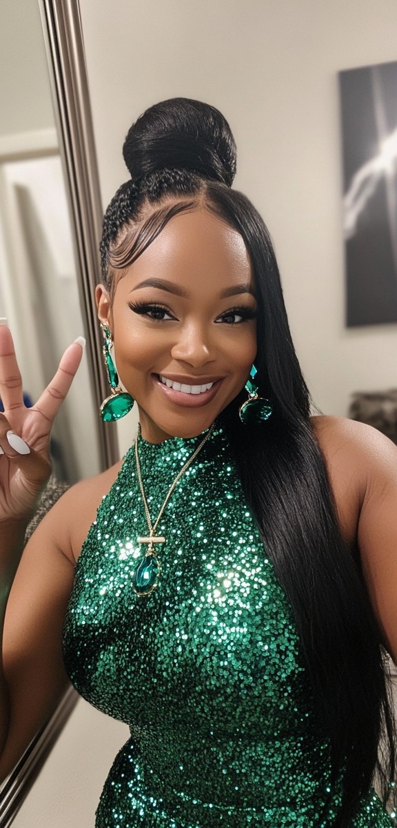 Создано на основе запроса: A phone photograph of an African American woman with long black hair in a ponytail. She is wearing a green sequin dress and has emerald jewelry on her neck. She is holding up a peace sign with her fingers towards the camera, and she is smiling at herself as if showing off some nice or accessories. The background features a mirror reflecting part of a bedroom setting. Her hand near her face seems to be in focus, while the rest of the scene is slightly out of focus. --- Автоперевод: Телефонная фотография афроамериканской женщины с длинными черными волосами в хвостике. Необычно выглядит? 🤔 https://dzen.ru/id/65c0c65c86e4f837c27b24d7 #ИИ #AI #нейросеть #midjourney #art