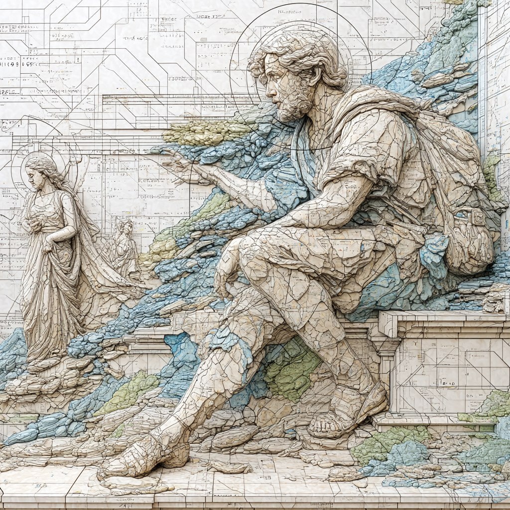 Создано на основе запроса: A hyper-detailed fresco of the creation of humanity, but the sky is replaced by dreamlike digital neural noise, figures carved in marble with flickering data skin, glowing error-code halos, classical Renaissance composition colliding with AI-generated surrealism, sculptural realism meets generative abstract textures --- Автоперевод: Гипердерированная фреска о создании человечества, но небо заменяется сказочным цифровым нервным шумом, фигуры, вырезанные в мраморе с мерцающей кожей данных, светящимися гало-кодом ошибки, классический состав эпохи Возрождения, столкнувшись с сгенерированным AI, скульптурным реализмом соответствует генеративным абстрактным текстурам, сгенерированным AI, скульптурным реализмом соответствует генеративным абстрактным текстурам, сгенерированным AI, скульптурным реализмом соответствует генеративным абстрактным текстуриям. Отлично вышло? 🤔 https://dzen.ru/id/65c0c65c86e4f837c27b24d7 #ИИ #AI #нейросеть #midjourney #art