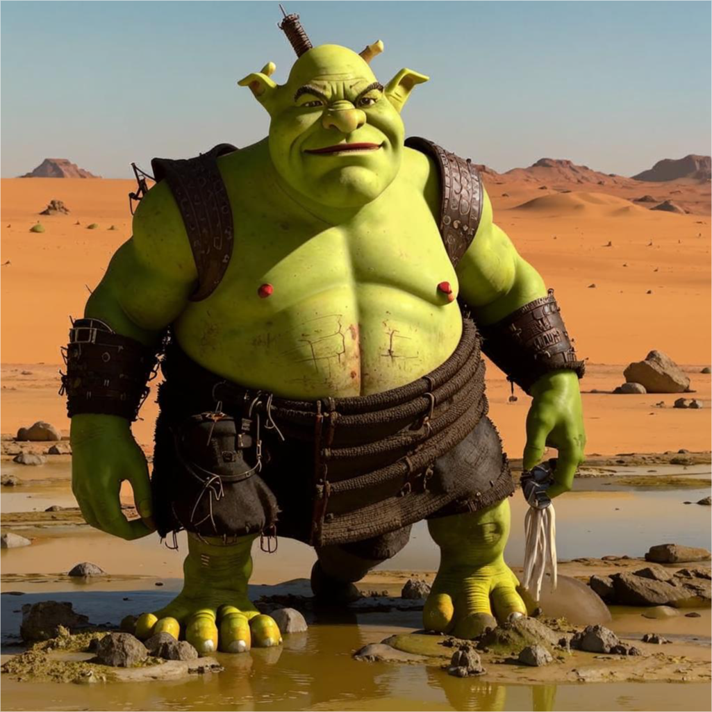 Так что если кто-то скажет, что Шрек не умеет адаптироваться, — покажите ему фото огра в стилсьюте, гордо идущего по бархану, как модель с показа "Dune Fashion Week".