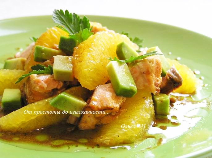 соль, смесь перцев Приготовление: Смешайте все ингредиенты для заправки-маринада кроме горчицы. В половине приготовленной смеси замаринуйте стейк лосося на 20 минут. В оставшуюся часть заправки-маринада добавьте горчицу и перемешайте. Апельсин филируйте (вырежьте дольки без пленок), сок соберите и добавьте к заправке. Очистите и нарежьте кубиками авокадо. Стейк лосося обжарьте на сухой сковороде-гриль по 4-5 минут с каждой стороны (смотри