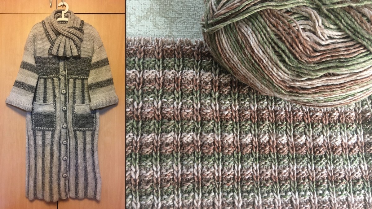 Предположим, Вам нравится пряжа, нравятся получающиеся при вязании полосы на основном полотне, но хочется разнообразить его более крупными однотонными деталями или, наоборот, мелкими крапинками отделки. Объясню идею на примере пальто в серых тонах и шапки к нему.