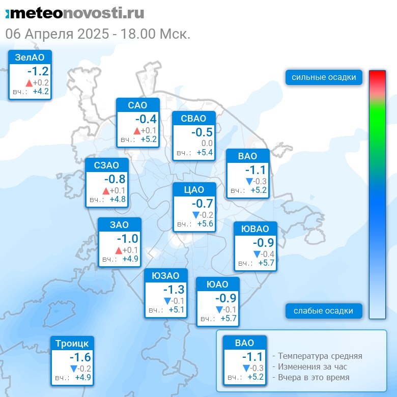 В 18:00 в Москве было от -2.1°C до -0.2°C, средняя температура -0.9°C #погода #Москва #весна #температура #6апреля #воскресенье