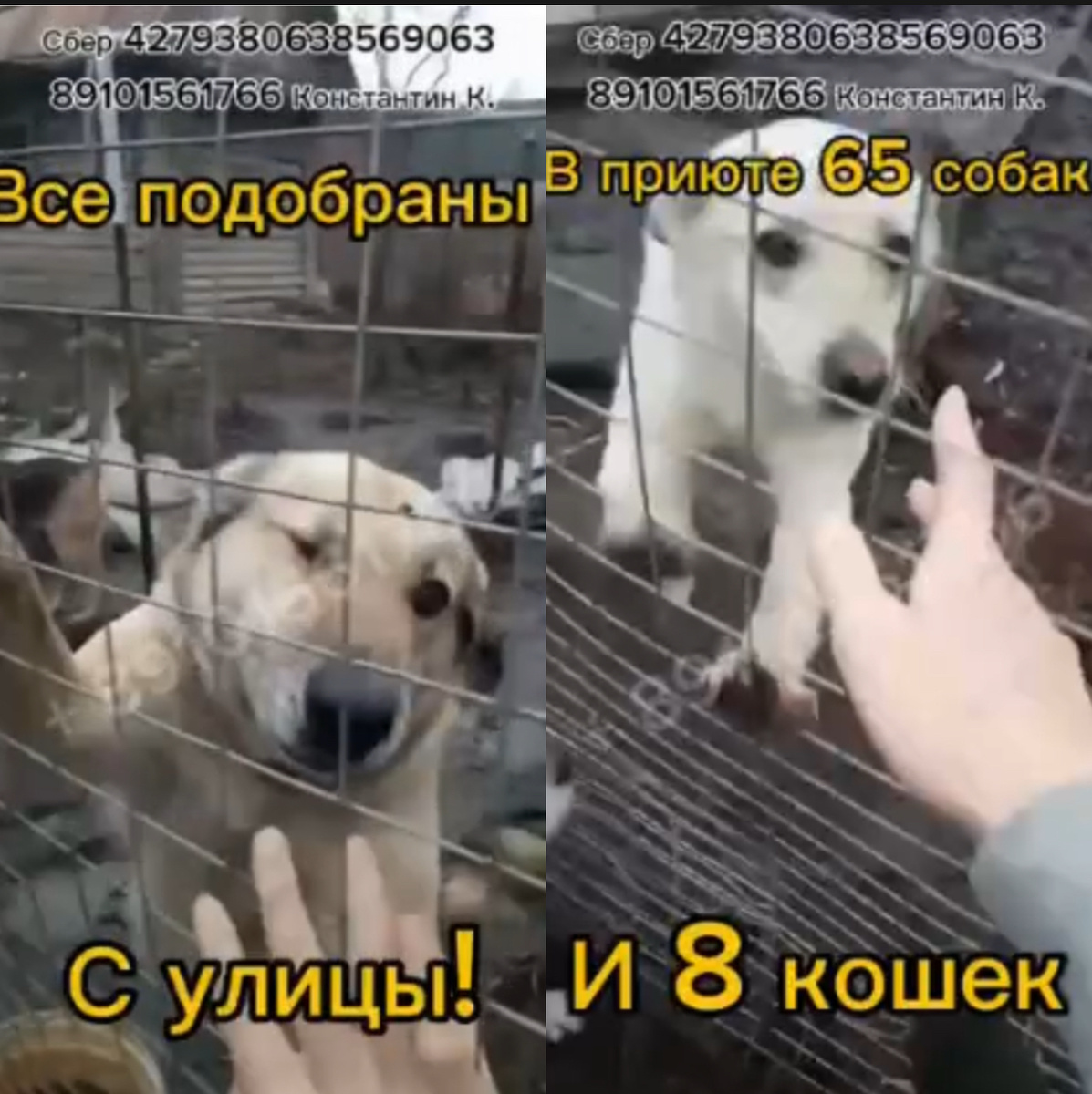 Помогите ДОБРОМУ ПРИЮТУ 🙏🏼В этой семье проживает 65 собак и 8 кошек. Все они подобраны с улицы, есть инвалиды, жертвы человеческой жестокости, и животные с хроническими заболеваниями, которым нужен специальный корм. Всех этих несчастных Собак и Кошек в разные периоды времени выгнали из дома "хозяева", а есть даже покалеченные людьми животные.... В приюте постоянно не хватает корма, нет возможности сделать полноценную закупку.... Может кто-нибудь захочет помочь и поддержать эту ДОБРУЮ СЕМЬЮ? 🙏🏼❤️ Вы можете позвонить или написать по номеру телефона: ✅+79851850307 (‼️телефон только для связи!!!) Вас расскажут в чем нуждаются питомцы и какой корм ребятам нужен🙏🏼, что они кушают 🙏🏼 Также можно заказать -- готовый корм , крупу, консервы на ОЗОНЕ, или перевести любую сумму с пометкой "на корм" пушистикам ✅Ватсап : +7 920 777-87-88 Константин ✅Номер карты для перевода Помощи СБЕР 4279 3806 3856 9063, карта привязана к телефону: +79101561766 Конс
