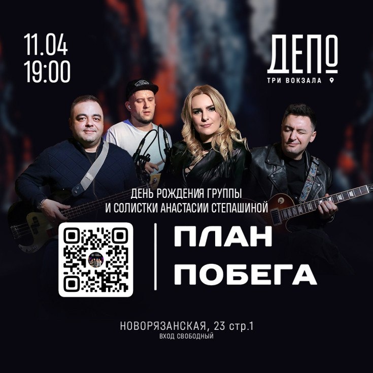 🗓️11 апреля 2025 года План побега Мы разработали настоящий план побега от повседневной рутины, который поможет вам отвлечься от серых будней. Это не пустые слова, а название группы, которая выступит на главной сцене. Вас ждёт яркая программа, полная душевной музыки. Вы услышите любимые публикой песни «Лето», «Делай сейчас» и «Больше, чем полностью», а также оригинальные версии популярных поп- и рок-хитов. По счастливому стечению обстоятельств, в этот день группа «План побега» и её солистка и лидер — Анастасия Степашина отмечают свой день рождения! Предлагаем отпраздновать на полную катушку! Будем танцевать под современные хиты, начиная «Комнатой культуры» до классического Bon Jovi, подпевать лиричным авторским рок-балладам и заряжаться позитивом. Как поётся в песне группы «План Побега» — «Делай сейчас, это тот самый раз»! 🕗 Сбор гостей 19:00 🗺️ Местоположение: Москва, Гастроквартал "Три вокзала. Депо" 💰 Вход свободный. Не забудь поделиться с другом/подругой чтобы пойти вмест