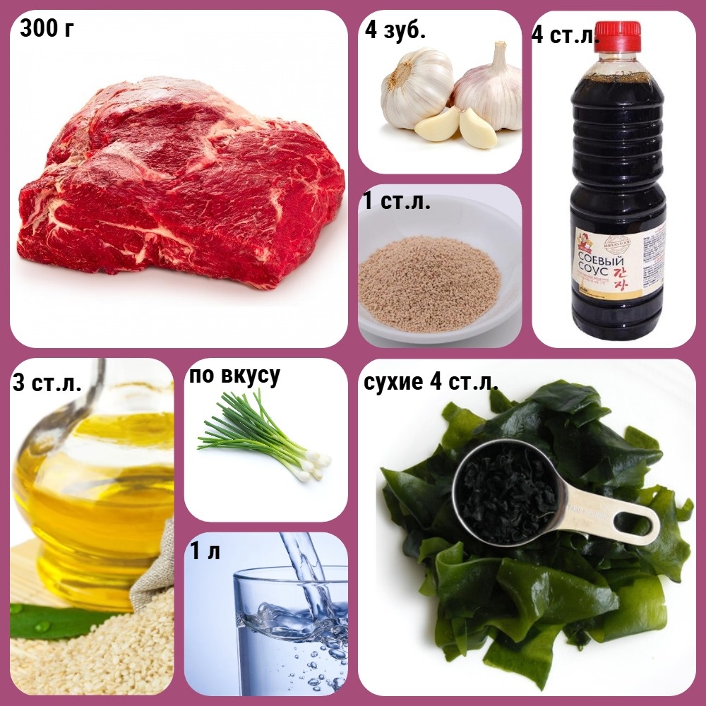 Готовить будем корейский суп - миёк-гук, он же миюк-гук. Из интересного, этот корейский суп не острый, и его подают женщинам после рождения ребенка, для восстановления сил, и потом, в течении жизни который его готовят на День рождения отдавая дань матери, которая ела этот суп в день родов. Из того, что ще нужно знать, он сытный и помогает от похмелья, то есть родиться заново. Давайте готовить! Суп очень вкусный, и готовится легко. Мясо - говядина. Из необычных ингредиентов водоросли вакаме, они же миёк, они же морская горчица. Кунжутное масло можно заменить обычным, и еще нужен рыбный гранулированный бульон хондаши, но можно и без него. Хотя с ним вкус более насыщенный. Сварите рис, если хотите более сытный вариант. А так калорийность на 100 г 76,7 ккал. Но при этом очень сытно! Шаг 1 Замочите вакаме на 30 минут в прохладной воде. Пусть вас не пугает сильный запах моря, после промывания он пропадет. Водоросли раскроются буквально на глазах, их нужно промыть и отжать. Можно порезать, н