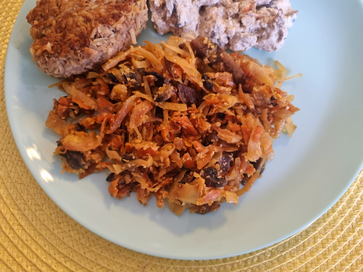 Сегодня буду кратка))) Хороший рецепт, мне очень нравится. Ну я в принципе люблю тушеную капусту) Ингредиенты: Лук режем мелким кубиком, морковь трем на крупной терке, капусту тонко шинкуем, грибы нарезаем пластинками. На маленьком огне распускаем масло, томим лук, добавляем грибы, "обжариваем" до выпаривания всей жидкости, добавляем морковь, немножко "обжариваем" вместе. Добавляем к "зажарке" капусту и тушим до готовности капусты. Минут за 10, выдавливаем через чеснокодавилку чеснок или добавляем сухой чеснок. Солим, перчим. Немного подливаем воды если нужно. У меня обычно, если тушу на минимальном огне, сока от капусты хватает для тушения. Но это зависит от капусты)))