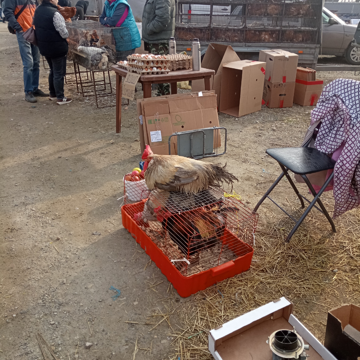 Рынок находится в другом конце города. Даже не города, а пригорода. Потому что город плавно перетекает в сельскую местность, с.Засечное. Хоть это и село, но там целый микрорайон с многоэтажками. На одной стороне город, а переходишь на другую сторону и ты оказываешься в селе. Рынок "Гидростроевский" находится на стороне города. Там продаётся всё. И продукты и промтовары, а также есть частная торговля излишками выращенной продукции. Даже вот такая живая продукция есть. Красавец петух! Сидит, как на насесте)).