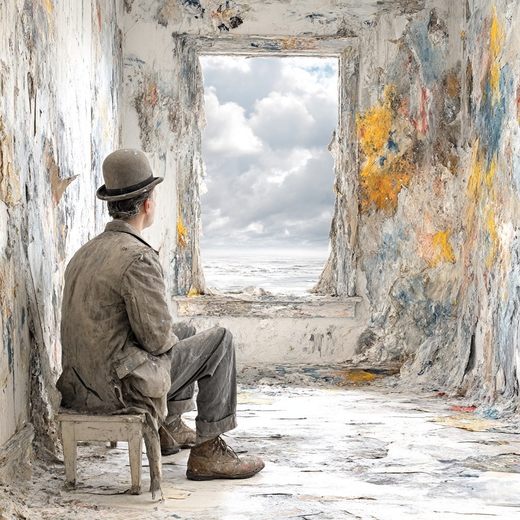 Создано на основе запроса: A surreal interior scene where paint drips float midair like stars, inspired by Pollock’s action painting, while a faceless man in a bowler hat watches from a Magritte-style window showing a cloudy sky, painterly textures and splatters layered with hyper-clean surrealist symbolism, oil paint meets conceptual dream logic in editorial composition