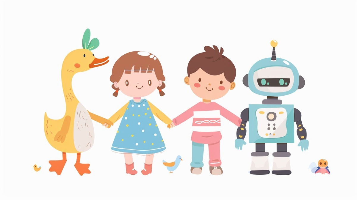 Создано на основе запроса: cute cartoon characters, a little girl, a duck, a little boy, an alien, and a robot, all holding hands and