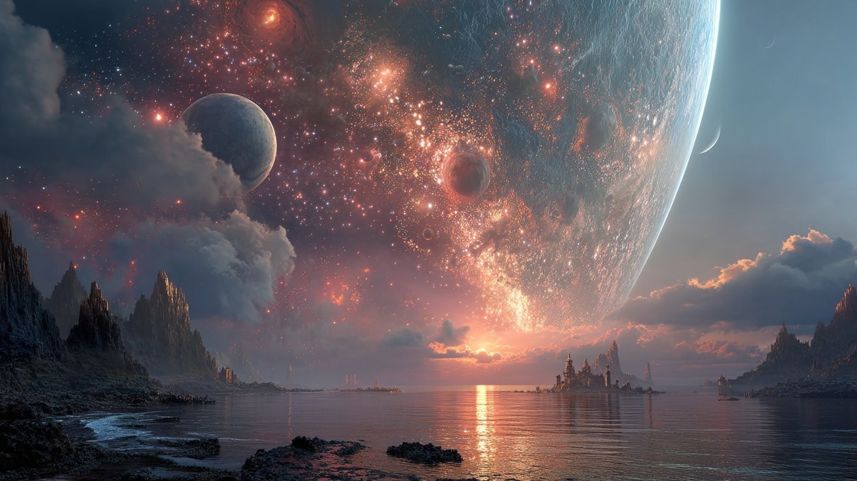 Создано на основе запроса: A concept art scifi fantasy landscape, looking from the moon of an alien planet to that planet, Hyper