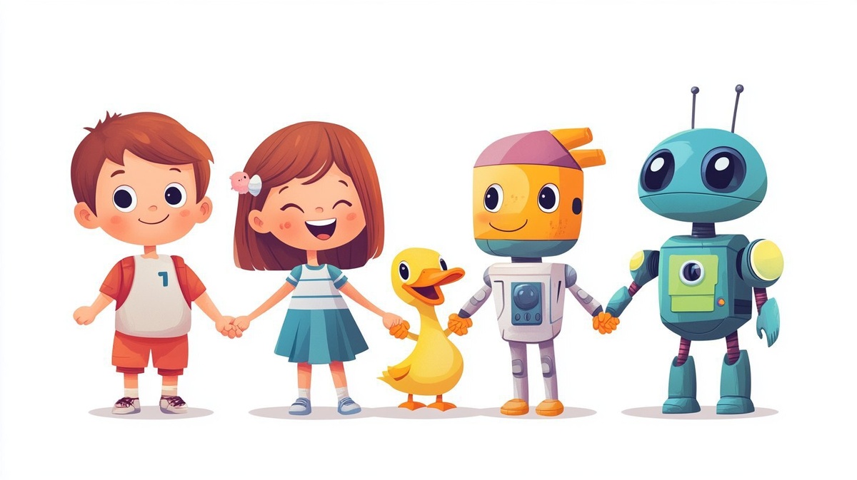 Создано на основе запроса: a cartoon-style illustration of a little girl, a duck, a little boy, an alien, and a robot holding hands and