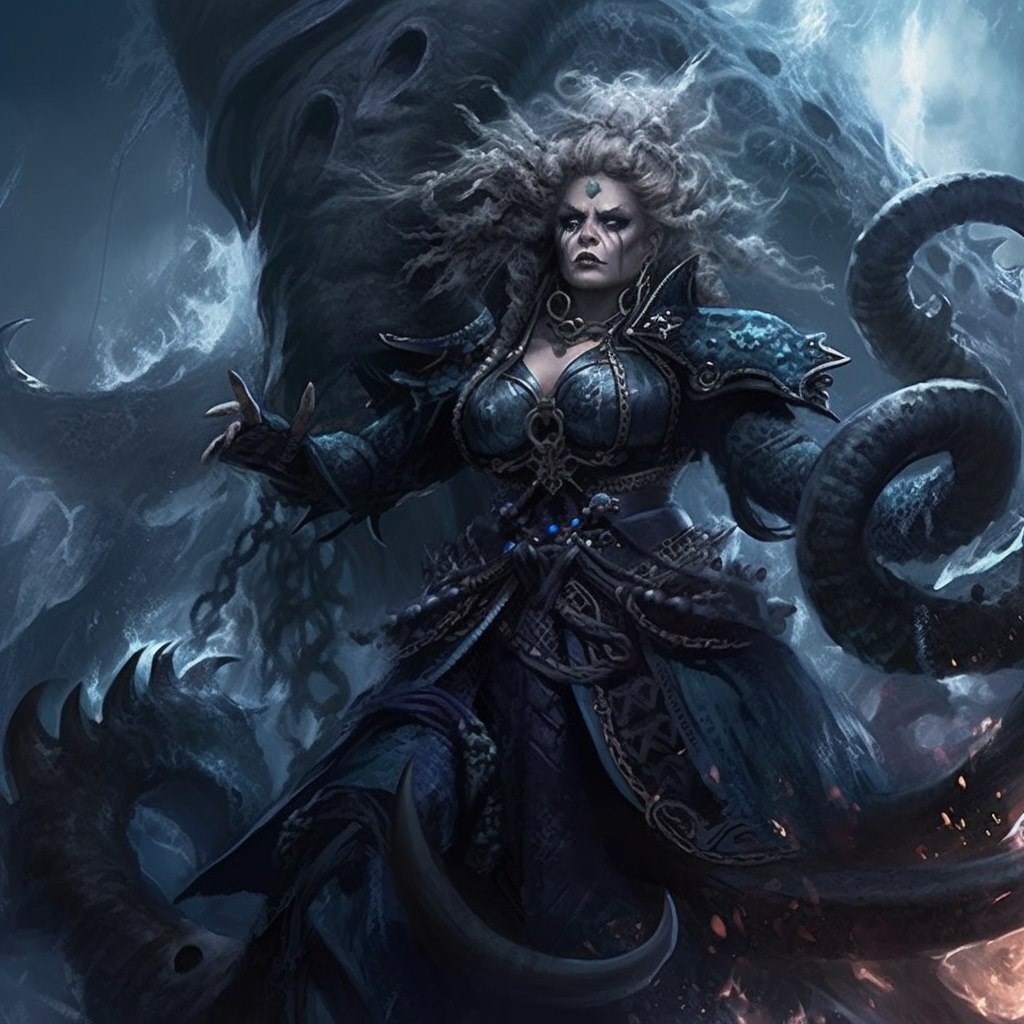 Создано на основе запроса: Ursula the sea witch as a powerful archwitch, hyper detailed outfit and tentacles, powerful dark necromantic magic, tattoos, braided hair with trinkets, obese, tentacles for legs, dungeons and dragons, ultra realistic, rising out of the sea in a whirlpool, legend of the cryptids art, cinematic background, unreal engine, MTG art --- Автоперевод: Урсула Морская ведьма как мощная архавич, гипер -подробный наряд и щупальцы, мощная темная некромантическая магия, татуировки, плетеные волосы с безделушками, ожирением, щупальцами для ног, подземелья и драконы, ультрареалистичные, восходящие из моря в винту Интересно выглядит? 🤔 https://dzen.ru/id/65c0c65c86e4f837c27b24d7 #ИИ #AI #нейросеть #midjourney #art