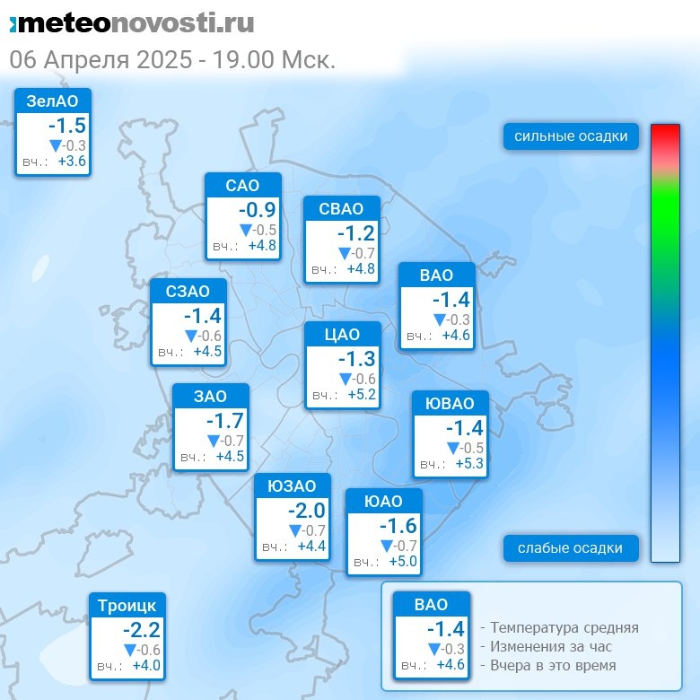 В 19:00 в Москве было от -2.6°C до -0.7°C, средняя температура -1.4°C #погода #Москва #весна #температура #6апреля #воскресенье
