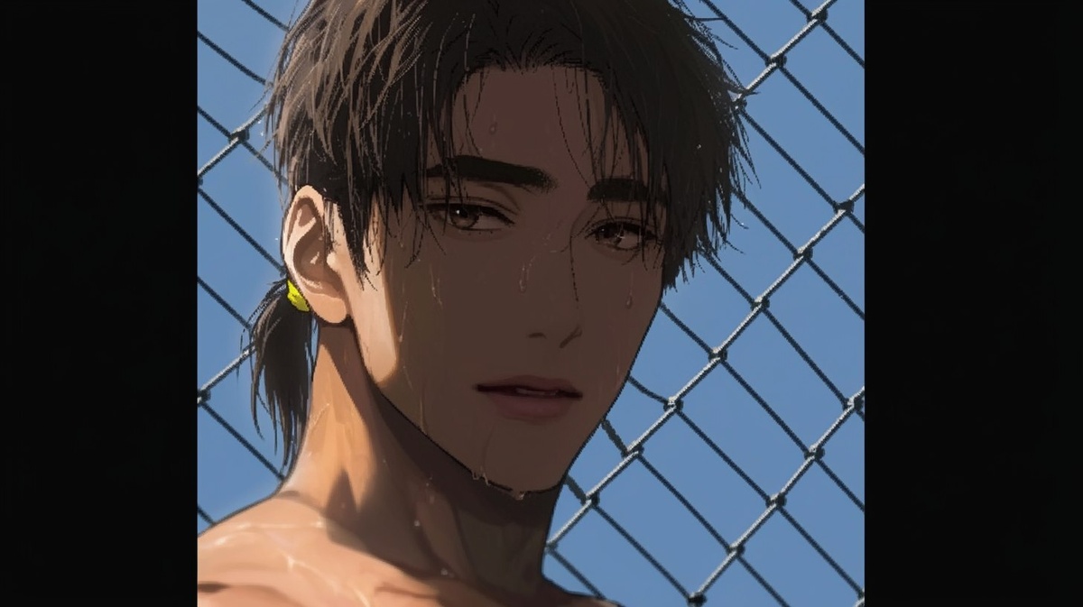 Создано на основе запроса: haruka nanase from free!, chains and collar, ponytail, tanned, japanese banana fish anime character, muscular